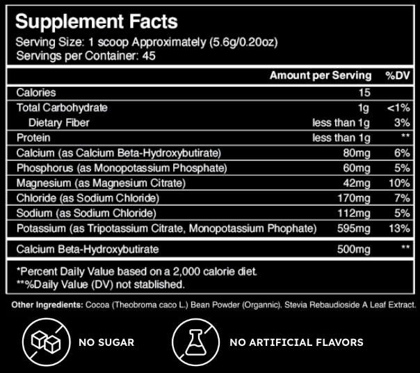 with the perfect balance of six essential electrolytes, ketone salts, and natural organic cocoa bean powder.